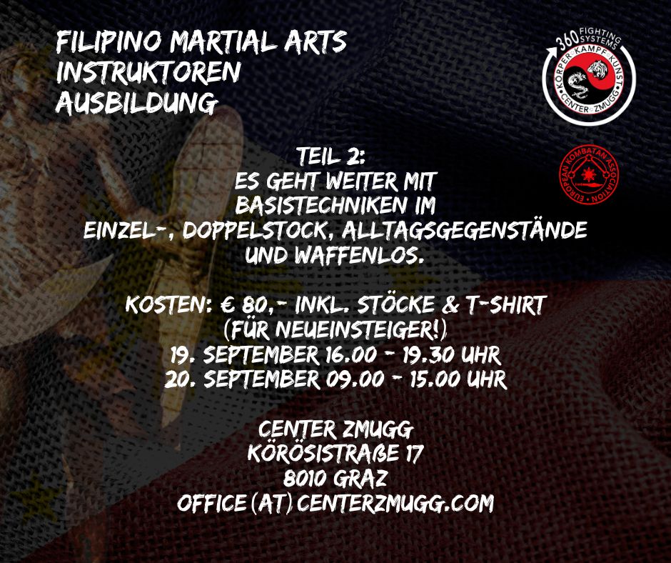Anmeldung für die Filipino Martial Arts Instruktoren Ausbildung – Teil 2 bitte formlos per E-Mail an office@centerzmugg.com, telefonisch unter +43 664 11 065 86 oder via Kontaktformular.
