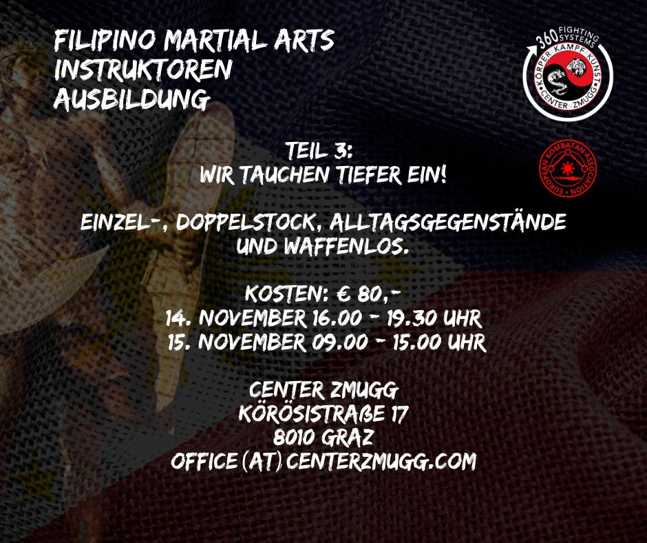 Anmeldung für die Filipino Martial Arts Instruktoren Ausbildung – Teil 3 bitte formlos per E-Mail an office@centerzmugg.com, telefonisch unter +43 664 11 065 86 oder via Kontaktformular.